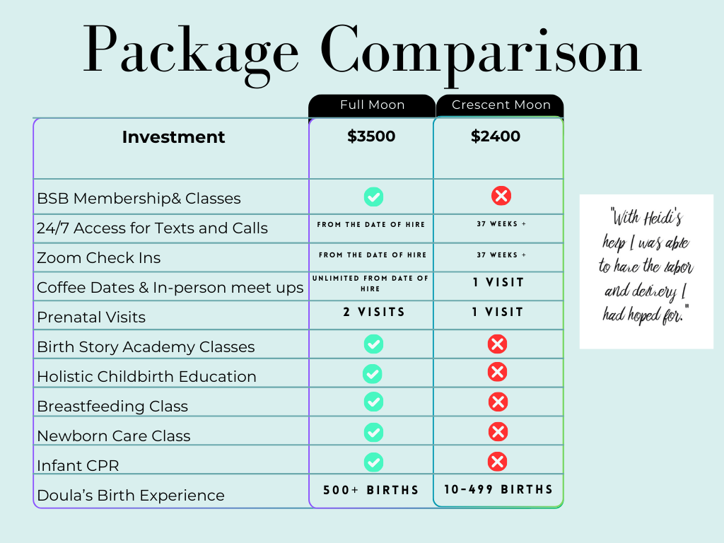 Standard Doula Services. From ongoing communication, birth, and early postpartum. Please click the image to review this package for doula support. Investment $2400.